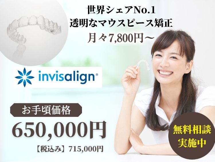 少しでも皆さまのご負担を抑えながら、見栄えの良い治療でご満足いただけるよう、マウスピース矯正「インビザライン」に力を入れているのが特徴です。矯正を専門とする歯科医院のご紹介も可能ですので、矯正治療が難しいと言われたことがある方もぜひ一度お問合せいただきたいと思います。